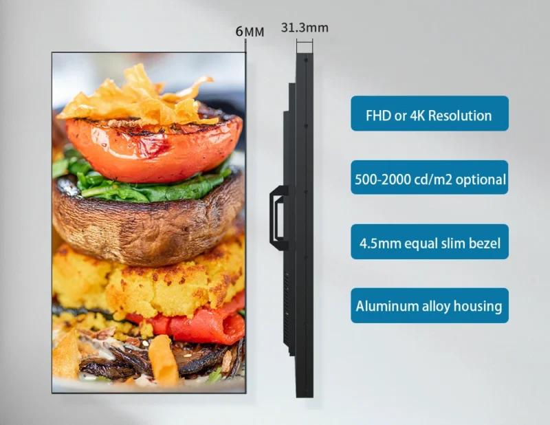 เทคโนโลยีการแสดงผล 4K ที่ล้ำสมัยที่สุด เพื่อให้มั่นใจว่าภาพที่แสดงผลมีความละเอียดสูงและเสมือนจริง สามารถนำเสนอทุกเมนูอาหารได้อย่างสดใสและชัดเจ โดยเลือกใช้แต่วัสดุที่ทนทานและมีคุณภาพสูงเท่านั้น เพื่อให้มั่นใจว่าจอแสดงผลดิจิทัลหน้าร้านของคุณจะรักษาประสิทธิภาพที่ยอดเยี่ยมไว้ได้ตลอดการใช้งานในระยะยาว ช่วยลดต้นทุนในการบำรุงรักษาได้อย่างดีเยี่ยม