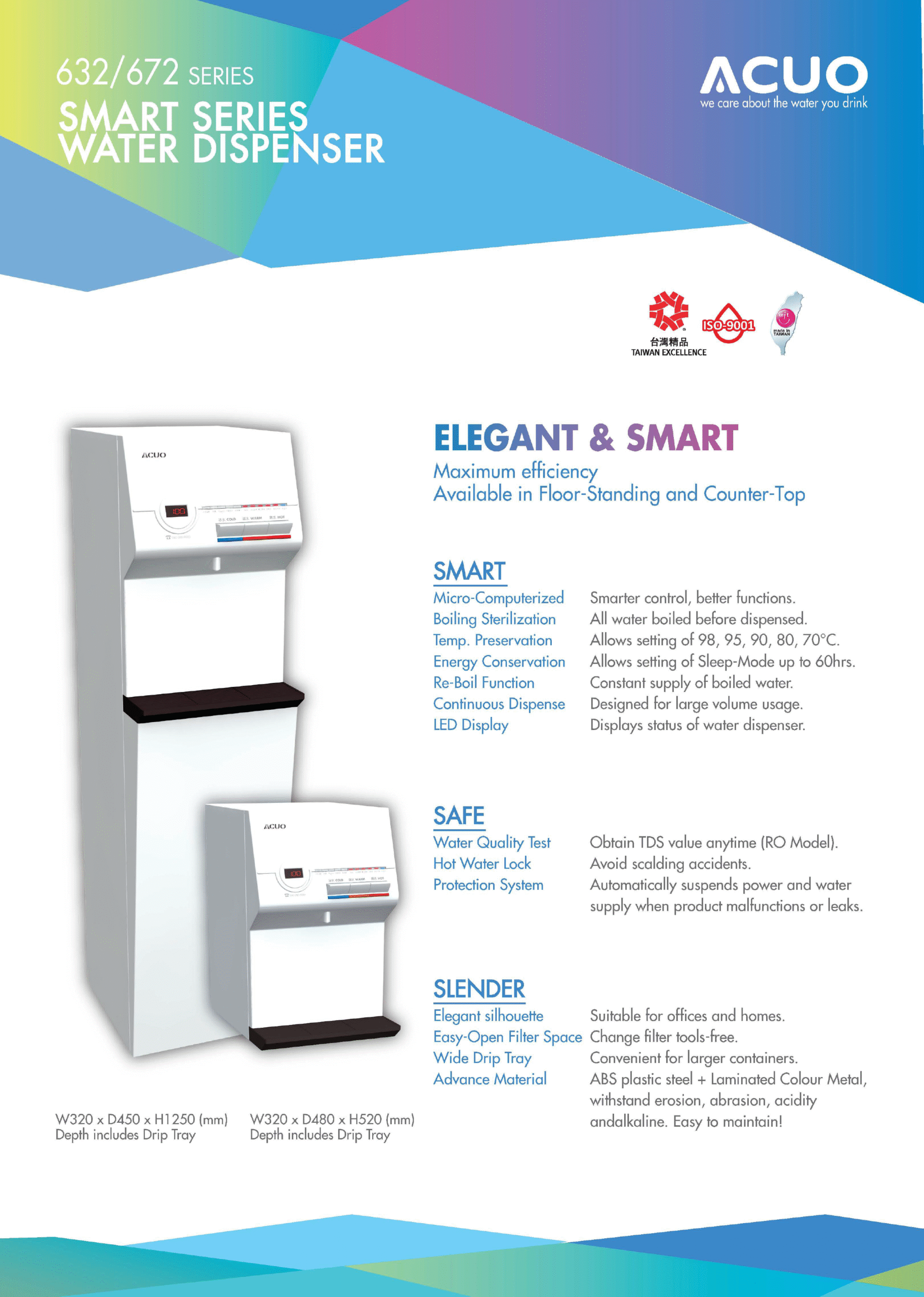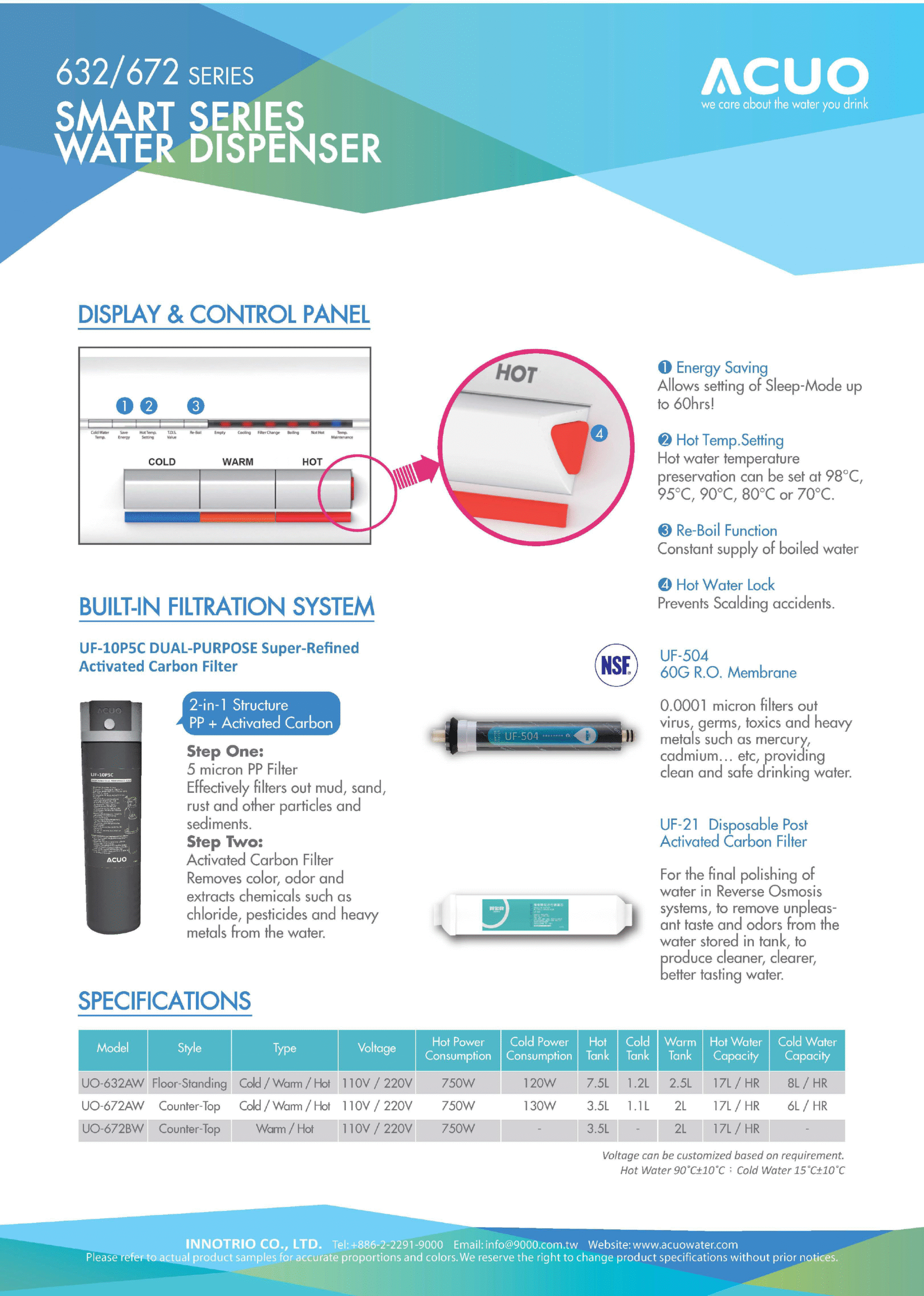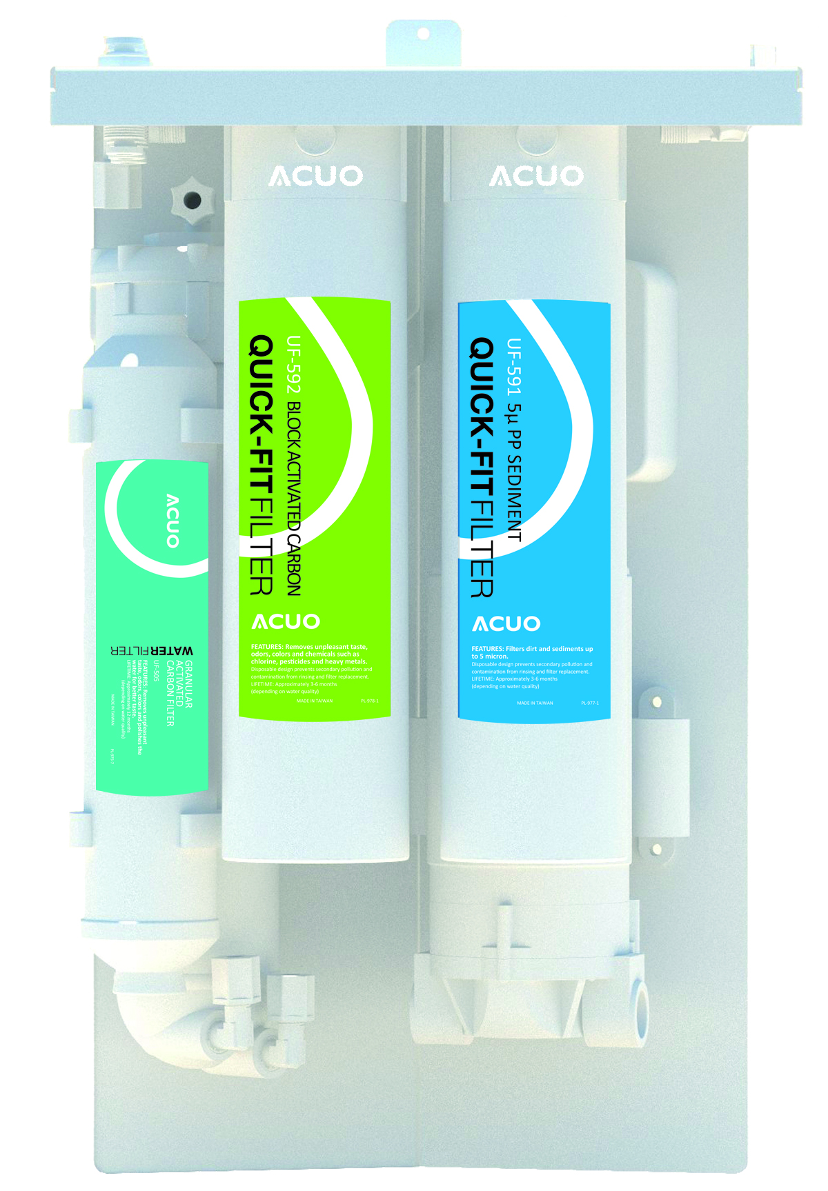 ระบบการกรองน้ำในตัว (Built-In Filtration) ระบบการกรองน้ำแบบครบวงจร ที่มาพร้อมกับไส้กรองที่มีคุณภาพและเป็นเอกลักษณ์เฉพาะของ ACUO ได้ถูกติดตั้งรวมอยู่ในเครื่องกดน้ำ (Water Dispensers) เพื่อมอบดีไซน์ที่เน้นการประหยัดพื้นที่ และความสะดวกสบายสูงสุดในการใช้งาน