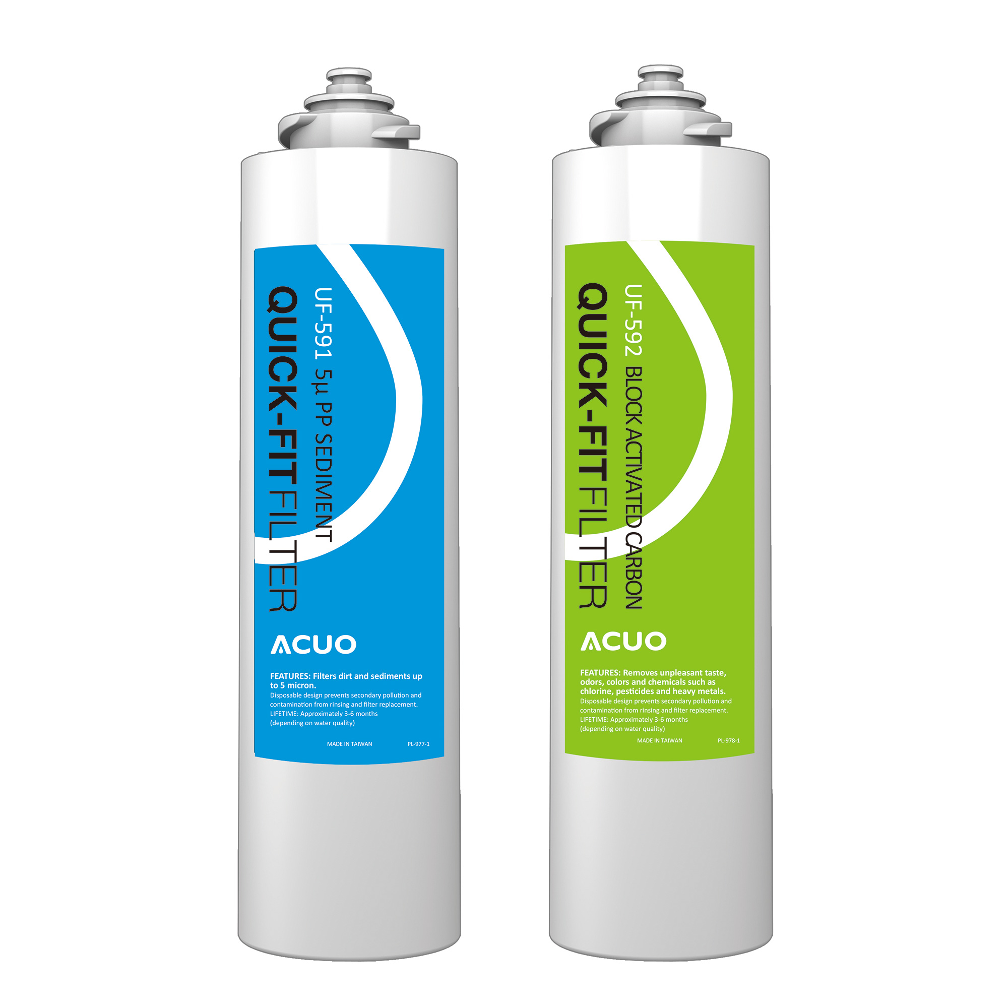 ทางเลือกที่ 1: ระบบกรอง PP + คาร์บอนกัมมันต์ (Activated Carbon)ระบบนี้ใช้ ไส้กรองแบบเปลี่ยนเร็ว (Quick-Fit) ที่ได้รับการรับรองจาก NSF ของ ACUO ซึ่งออกแบบด้วยวัสดุกรองคุณภาพสูงที่ได้มาตรฐานสากล ตลับไส้กรองแบบเปลี่ยนเร็วและแบบใช้แล้วทิ้ง (disposable design) ช่วยป้องกันการปนเปื้อนซ้ำซ้อน