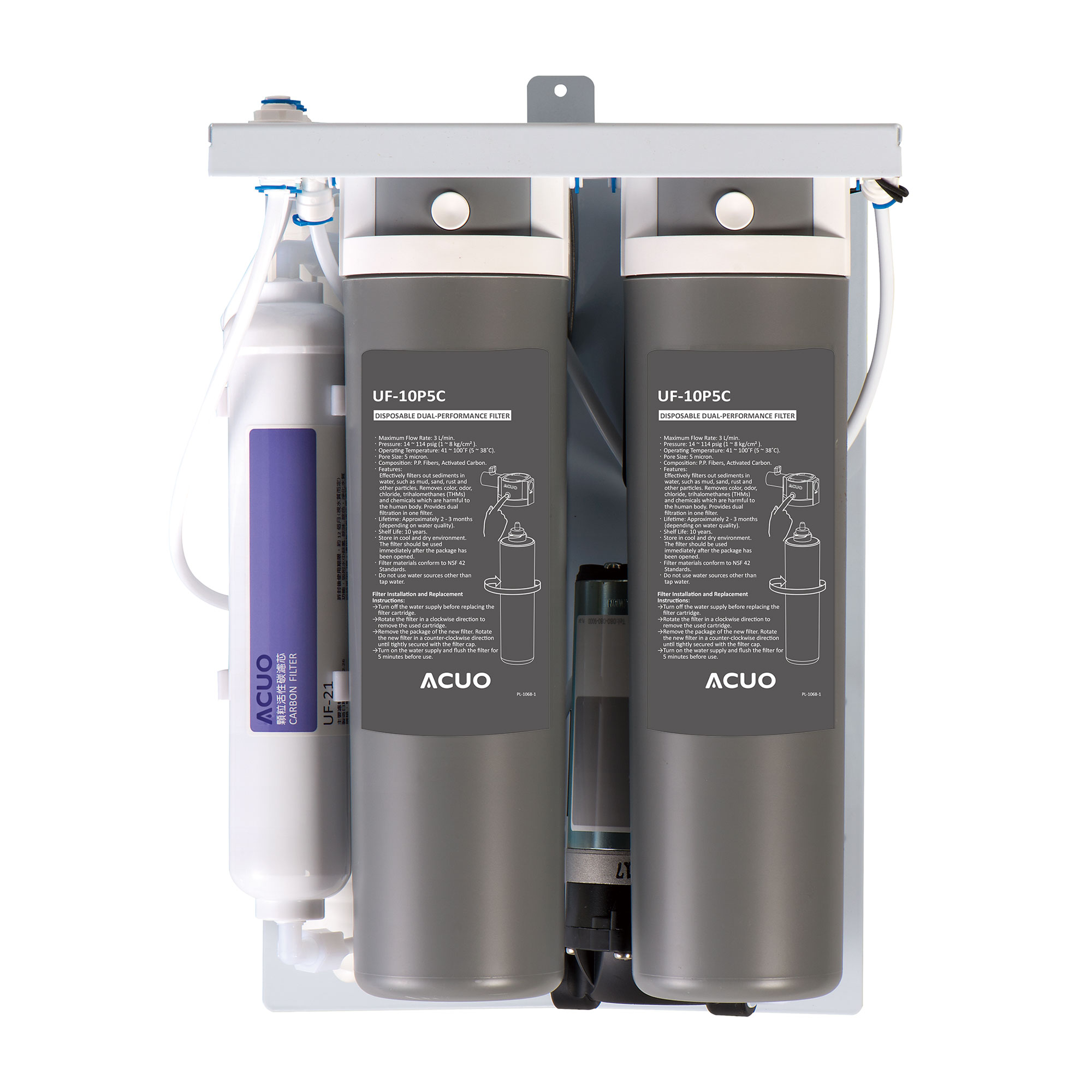 ระบบนี้ใช้ ไส้กรองใยผ้าคาร์บอนกัมมันต์บริสุทธิ์พิเศษแบบสองวัตถุประสงค์ (UF-10P5C) ของ ACUO เป็นไส้กรองขั้นต้น (pre-filters) ร่วมกับ เยื่อกรอง R.O. (R.O. Membrane) และ ไส้กรองคาร์บอนกัมมันต์ขั้นสุดท้าย (Post Activated Carbon Filter)