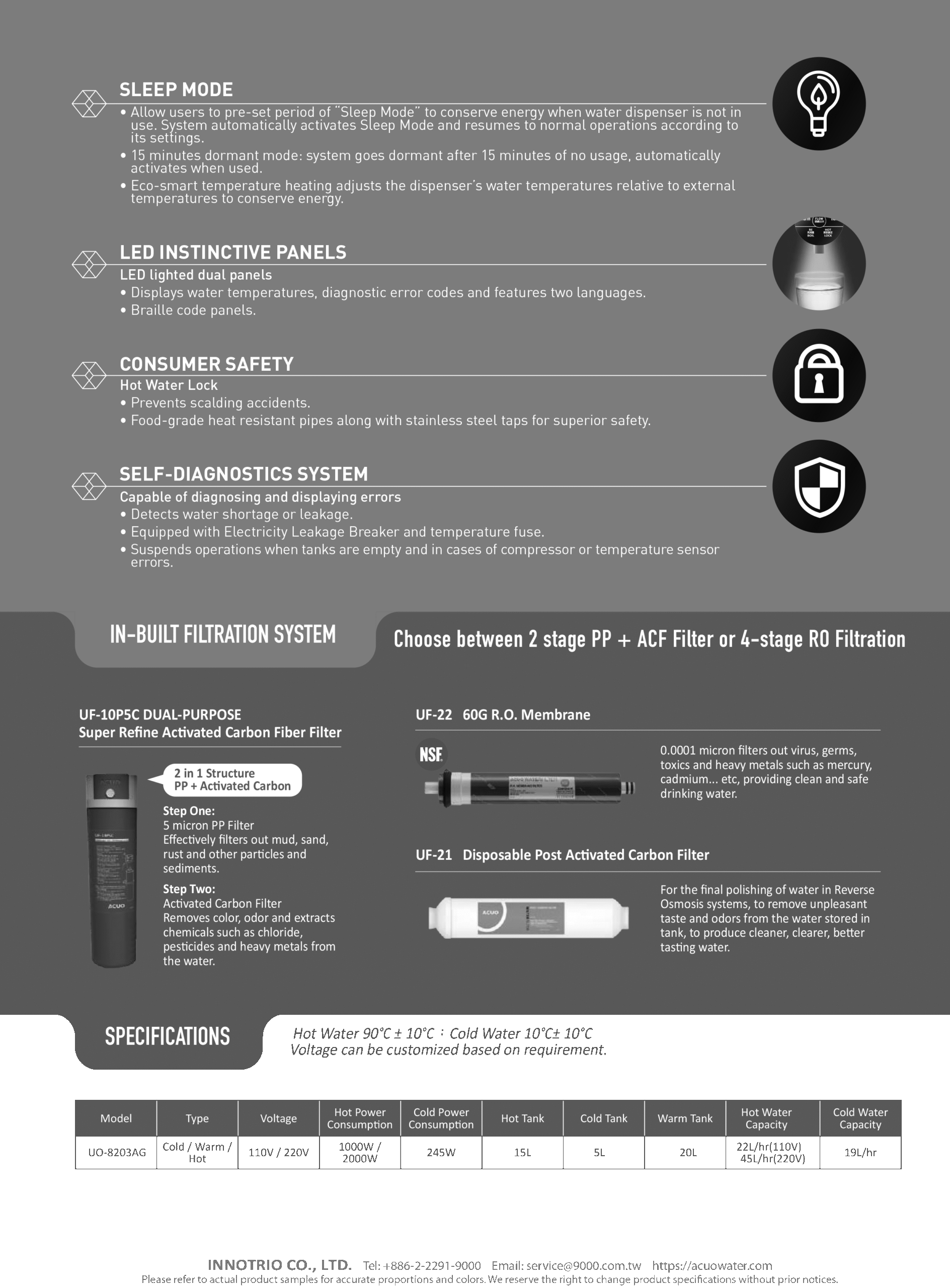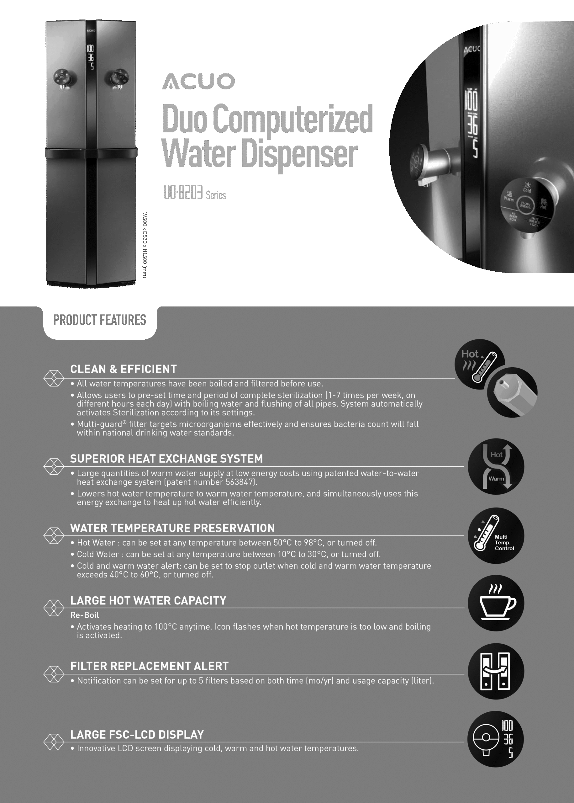 ระบบการกรองน้ำแบบครบวงจร ที่มาพร้อมกับไส้กรองคุณภาพและเป็นเอกลักษณ์เฉพาะของ ACUO ได้รับการติดตั้งรวมอยู่ในเครื่องกดน้ำ (Water Dispensers) เพื่อมอบดีไซน์ที่เน้นการประหยัดพื้นที่ และความสะดวกสบายสูงสุดในการใช้งาน