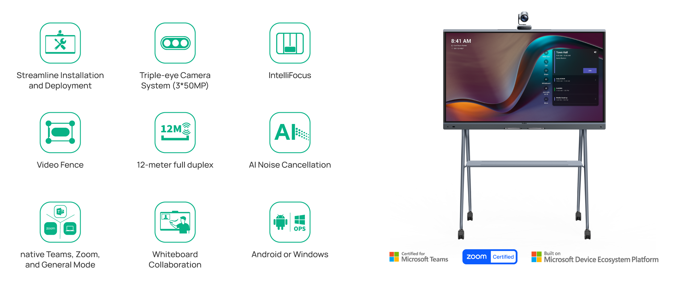 Yealink MeetingBoard Pro คืออุปกรณ์การประชุมแบบ All-in-one รุ่นล่าสุด มีให้เลือกถึง 3 ขนาด (65 นิ้ว, 75 นิ้ว และ 86 นิ้ว) ออกแบบมาเพื่อรองรับห้องประชุมตั้งแต่ขนาดเล็กไปจนถึงขนาดใหญ่ อุปกรณ์อัจฉริยะนี้ได้รวมฟังก์ชันการประชุมผ่านวิดีโอ การแชร์เนื้อหาแบบไร้สายความละเอียดสูง และไวท์บอร์ดอิเล็กทรอนิกส์เข้าด้วยกัน โดยรองรับคุณภาพการวิดีโอคอลสูงสุดที่ระดับ 4K
