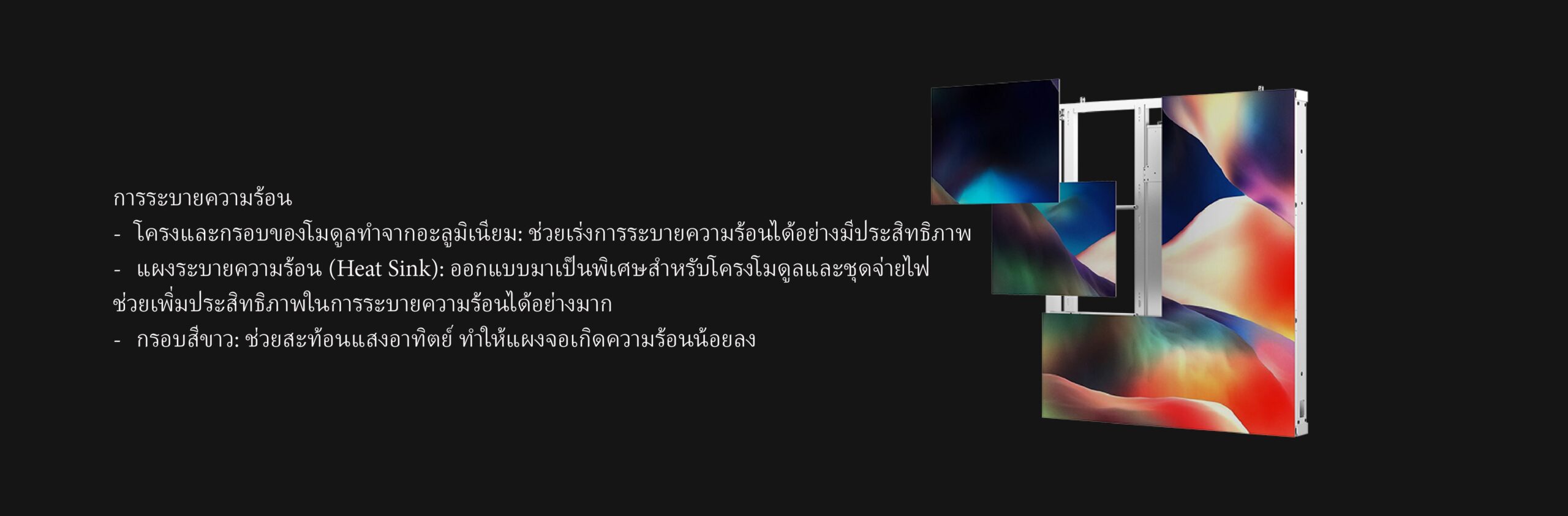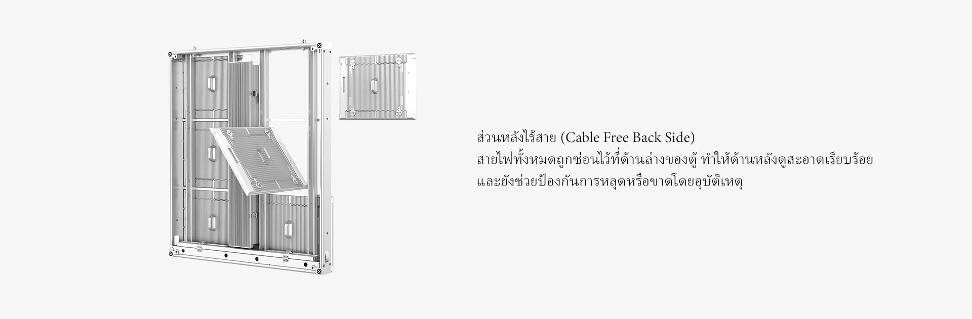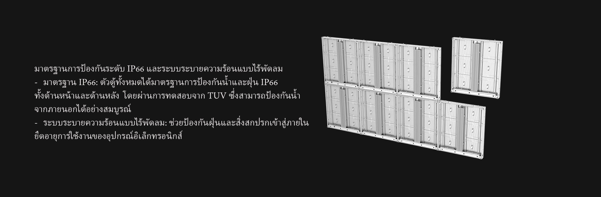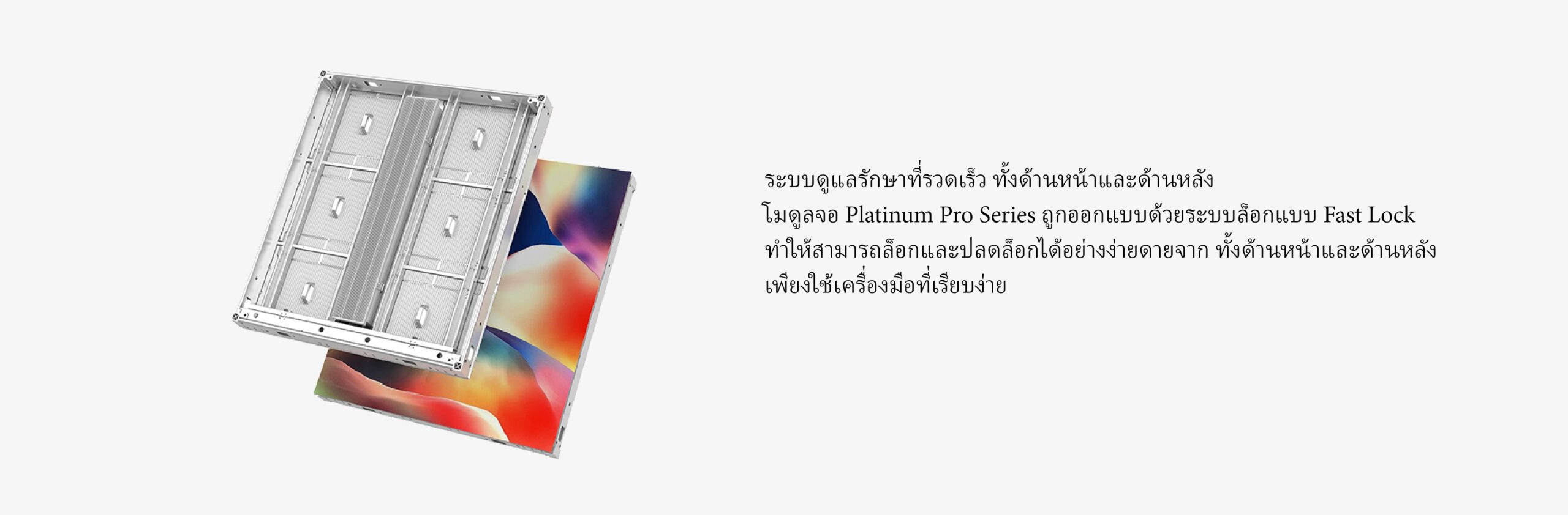 Platinum Pro Series โซลูชันจอแสดงผล LED ภายนอกอาคาร ขนาด: 800*1,200*107.4 มม. ระยะห่างระหว่างพิกเซล (Pixel Pitch) สำหรับใช้งานภายนอกอาคาร: 6.67 มม., 8.33 มม., 10 มม. การใช้งาน: เหมาะสำหรับตลาดโฆษณาดิจิทัลนอกบ้าน (DOOH), ป้ายโฆษณาบิลบอร์ด, ป้ายจราจร, จอในสนามกีฬา และอื่นๆ คุณสมบัติเด่น อัตราส่วนภาพทองคำ 16:9 ทำให้การแสดงผลดูสมดุลและสวยงาม ความสว่างสูงถึง 10,000 nits (SMD Outdoor) ให้ภาพคมชัด สู้แสงแดดได้ดีเยี่ยม แม้ในเวลากลางวัน สามารถบำรุงรักษาได้ทั้งด้านหน้าและด้านหลัง สะดวกต่อการติดตั้งและซ่อมแซม ระบบระบายความร้อนแบบไร้พัดลม (Fanless) ทำงานเงียบ และประหยัดพลังงาน ด้านหลังดีไซน์ไร้สาย (Cable Free) ทำให้การติดตั้งดูเรียบร้อย สวยงาม และปลอดภัย Specifications