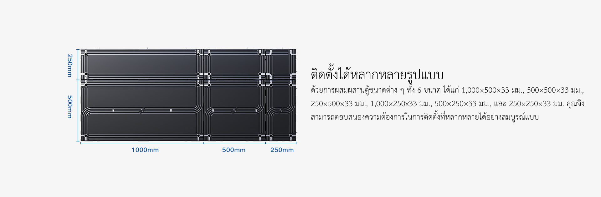 ขนาด: 1,000 x 500 x 33 มม., 500 x 500 x 33 มม., 250 x 500 x 33 มม., 1,000 x 250 x 33 มม., 500 x 250 x 33 มม., 250 x 250 x 33 มม.